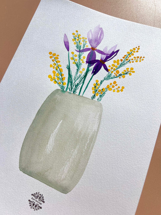 Aquarelle A4 - Iris et mimosa en vase