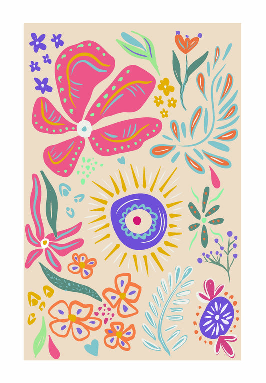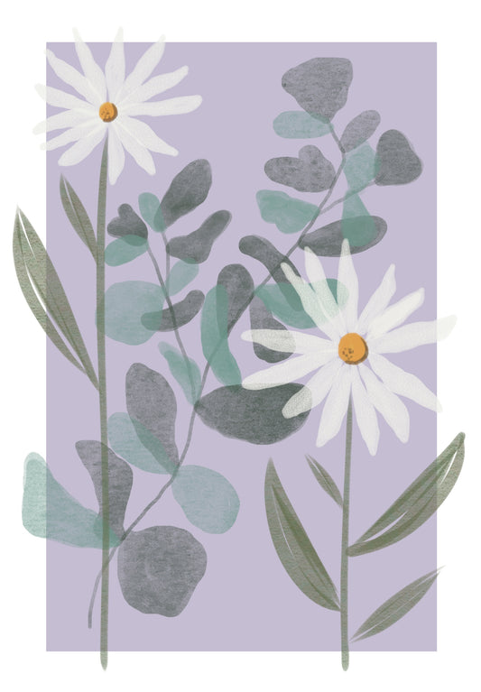 Illustration numérique A4 - Marguerites et eucalyptus sur fond violet
