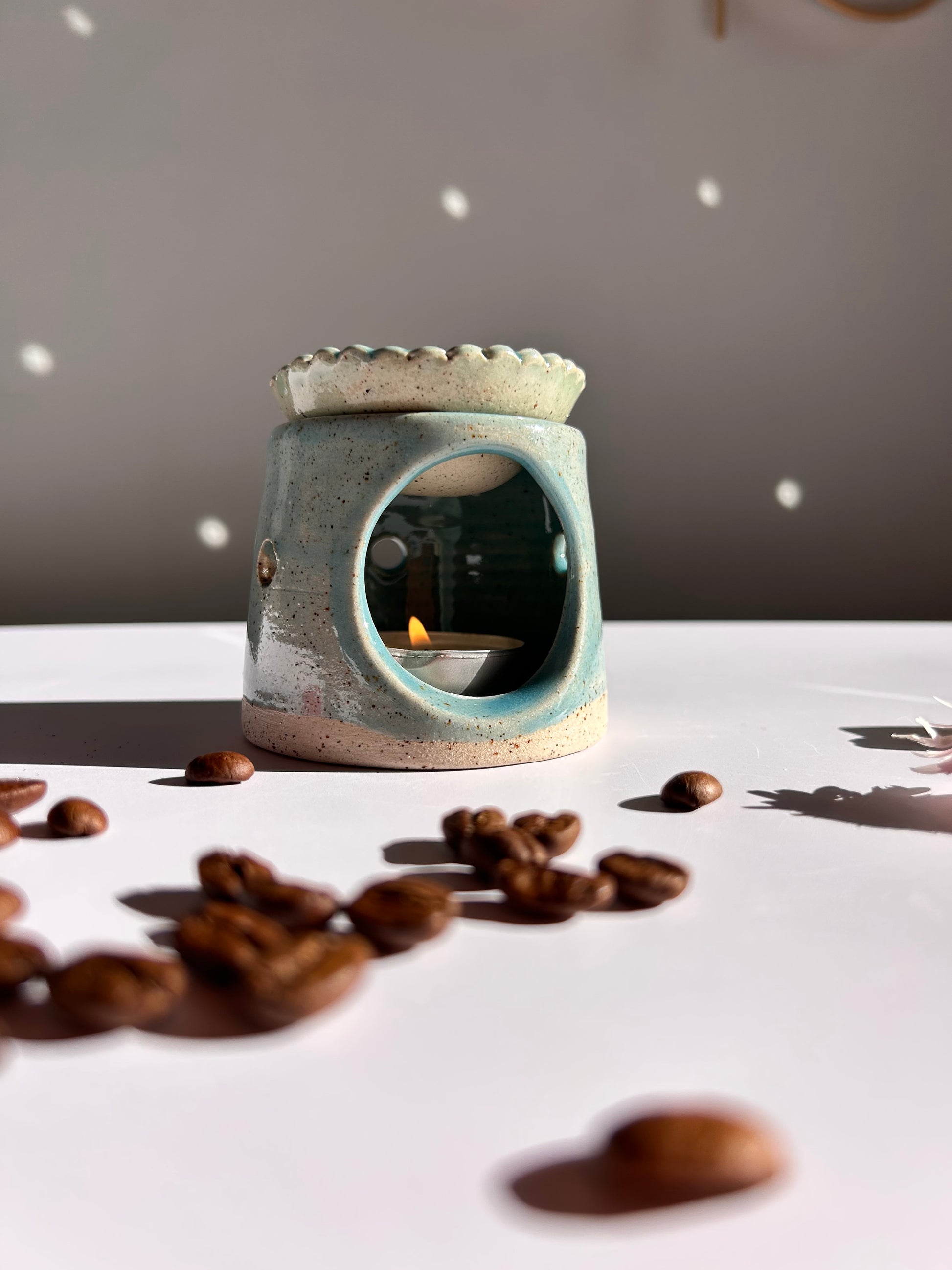 Brûle-parfum en céramique façonné et ajouré à la main. Les motifs percés diffusent de petites ombres délicates contre un mur ou sur une table. 🕯️