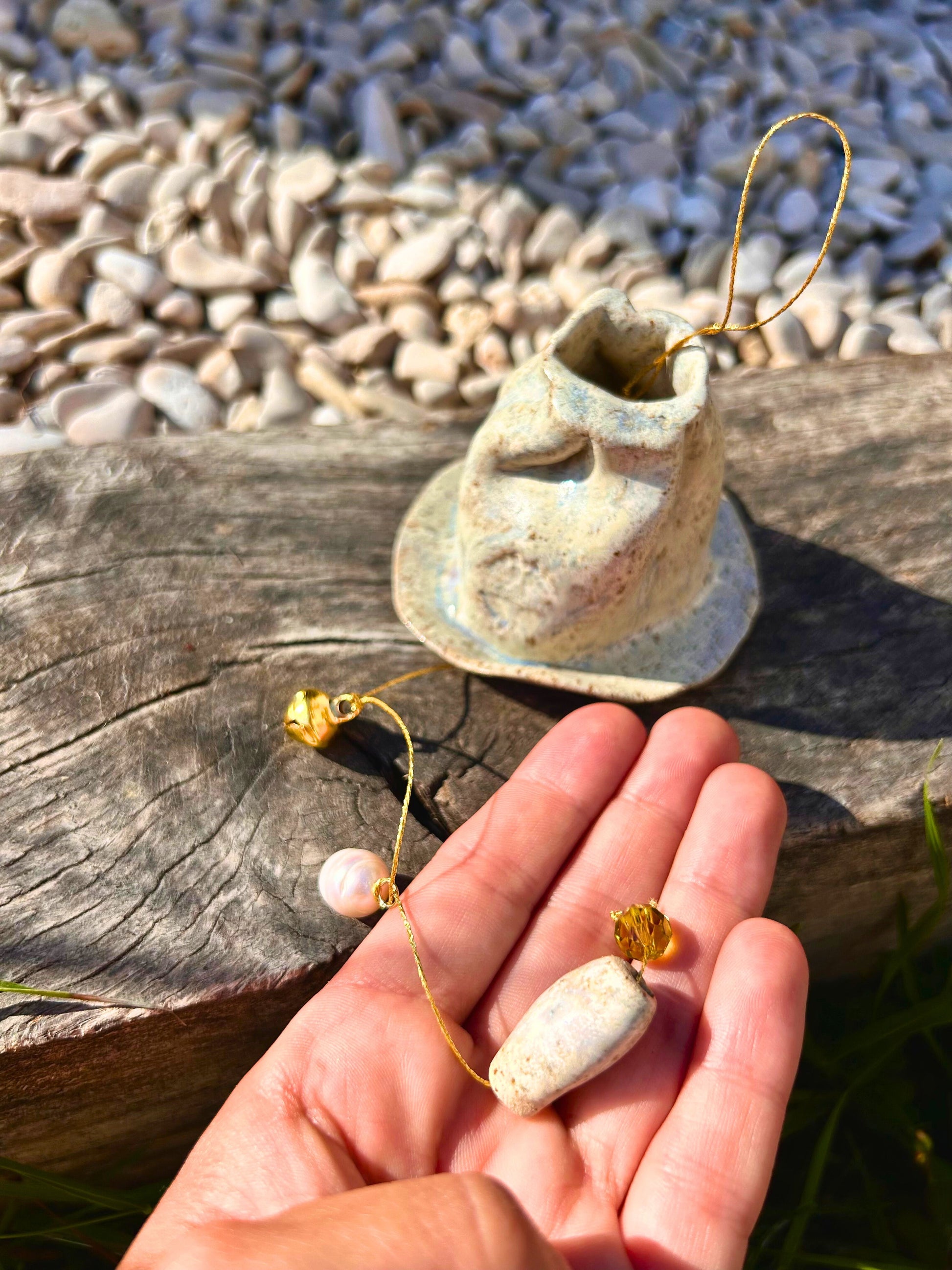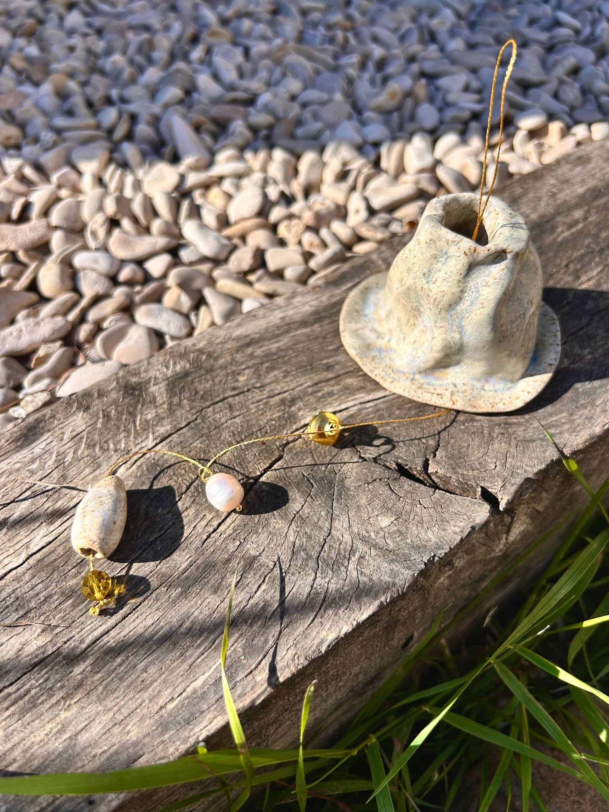 Fabriquée en céramique, cette pièce est réalisée avec un émail délicat créant des effets visuels uniques sur les créations. Ce mobile est joliment décoré de perles et de clochettes avec un fil doré.