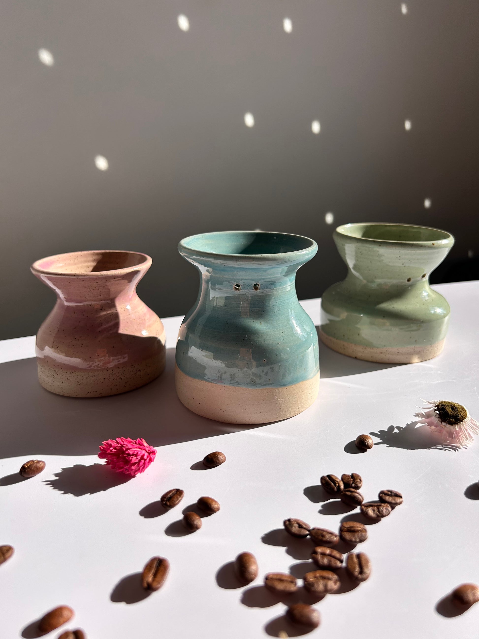 Un vase germoir en céramique, façonné à la main, pensé pour faire germer un noyau d’avocat de manière saine et esthétique.
